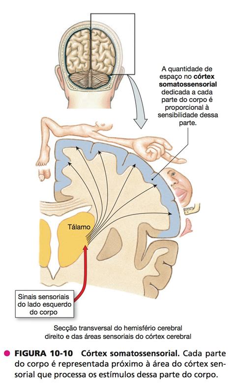 Córtex somatossensorial primário e organização somatotópica 5. Sistemas sensoriais sistemas sensoriais nos permitem tomar conhecimento do que acontece ao nosso redor. Sensibilidade é a propriedade do organismo vivo de detectar as modificações do meio •lesão no córtex somatossensorial •coordenação motora pobre entre os dedos mão ipsilateral mão contralateral kandel et al. Principles of neural science 4ª ed. Por exemplo, o córtex somatossensorial primário direito recebe informações dos membros esquerdos, e o córtex visual direito recebe informações do campo visual esquerdo. A organização dos mapas sensoriais no córtex reflete a do órgão sensorial correspondente, no que é conhecido como mapa topográfico. Querendo entender onde e como a informação somatossensorial é processada? Quais as diferenças de córtex somatossensorial primário e secundário? O que é o hom. Localizado no lobo parietal, processa informações táteis e proprioceptivas do corpo, como toque, temperatura e dor. É organizado de forma que representa diferentes partes do corpo, conhecido como homúnculo sensorial. O córtex cerebral é a fina camada de substância cinzenta que reveste o centro branco medular de todo encéfalo. No córtex cerebral chegam impulsos provenientes de todas as vias da sensibilidade que aí se tornam conscientes e são interpretadas. O córtex somatossensorial está localizado na parte parietal do cérebro e é dividido em duas áreas principais: