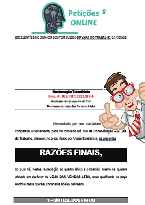 Ima, consoante as razões de fato e de direito a seguir expostas. Alegações finais no novo cpc de 2015, modelo de petição, ação de indenização por dano moral por negativação indevida, memoriais cíveis, razões finais cíveis, ação de reparação de danos morais, peça processual pronta , com doutrina e jurisprudência, Dicas extras de como fazer razões finais trabalhistas. Você tem que sair do escritório mais ou menos com a sua estratégia de ação definida, inclusive se fará ou não razões finais. Digo mais ou menos, porque muitas coisas podem acontecer na audiência. Esteja preparado para fazer as razões finais na hora. [modelo] razões finais/memoriais trabalhista ao douto juízo da___ vara do trabalho da comarca___ do estado___ nome completo do reclamante ou reclamado,. Do reclamante ou reclamado, devidamente qualificado nos autos em epígrafe, vem por meio de seu procurador apresentar razões finais. § 2º quando a causa apresentar questões complexas de fato ou de direito, o debate oral poderá ser substituído por razões finais escritas, que serão apresentadas pelo autor e pelo réu, bem como pelo ministério público, se for o caso de sua intervenção, em prazos sucessivos de 15 (quinze) dias, assegurada vista dos autos. Modelo razões finais (em ação possessória) modelos publicado em 11/11/2023 por ana paula dias. As razões finais se constituem no último ato processual praticado pelas partes, antes da prolação da sentença, podendo ser manifestadas oralmente, no encerramento da audiência de instrução. Modelo de razões finais visando a exposição detalhada dos fatos, das provas e do direito aplicável, em conformidade com a legislação processual civil brasileira, notadamente os artigos do código de processo civil que regulamentam a matéria. Pesquisar e consultar modelos sobre razões finais. Acesse o jusbrasil e tenha acesso a notícias, artigos, jurisprudência, legislação, diários oficiais e muito mais de forma rápida, objetiva e gratuita. A reclamada alega que a reclamante não comprovou os requisitos necessários para o reconhecimento do vínculo empregatício com a tomadora de serviços.